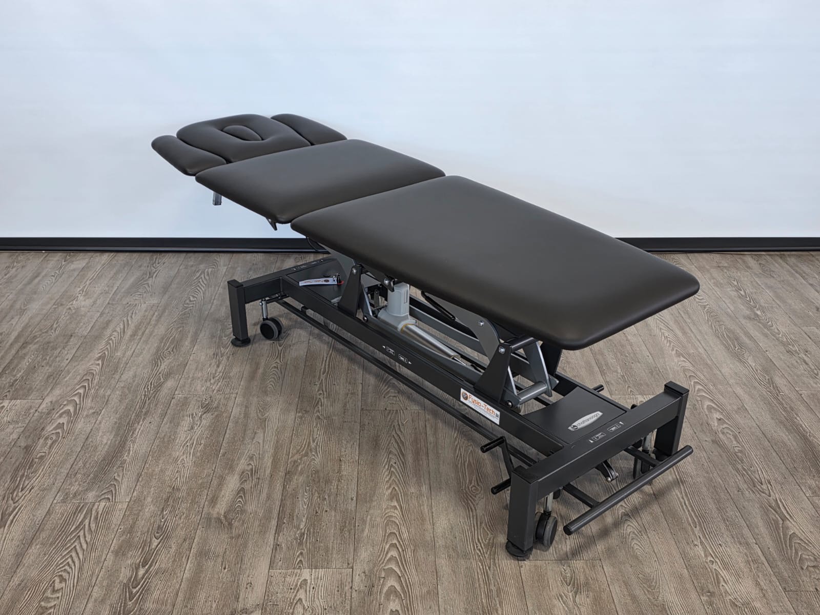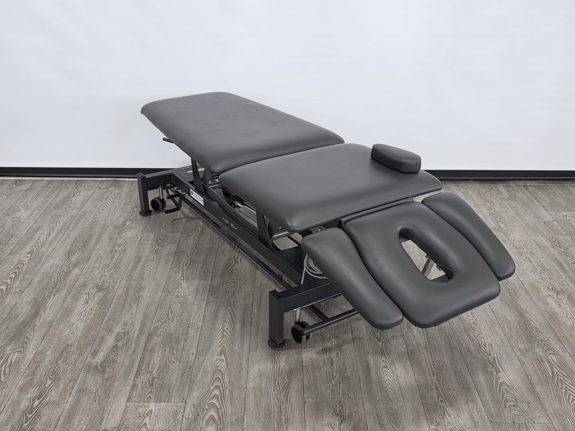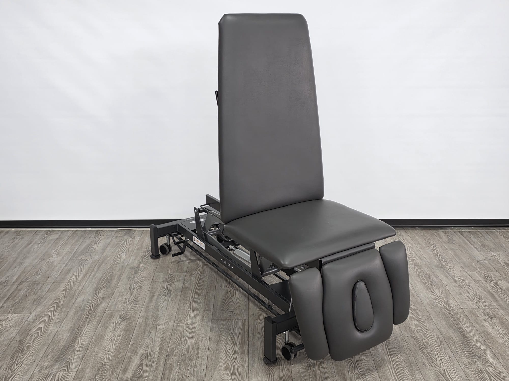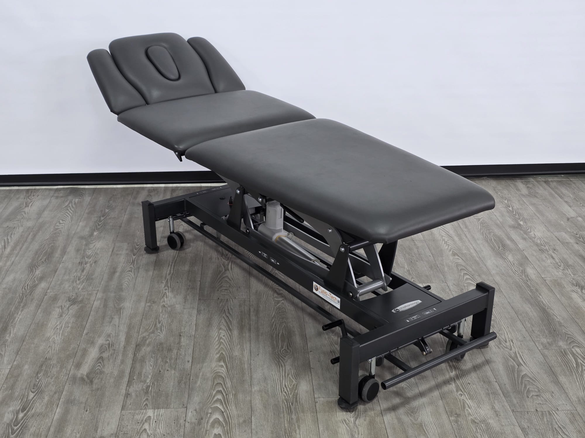 De behandeltafel is voorzien van wielen en een centraal wielhefsysteem. Alle delen kunnen worden bediend doormiddel van gasveren.