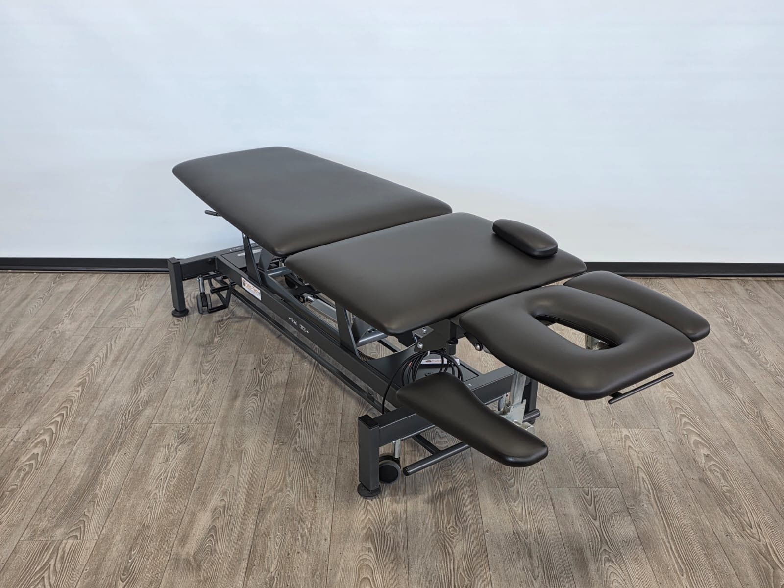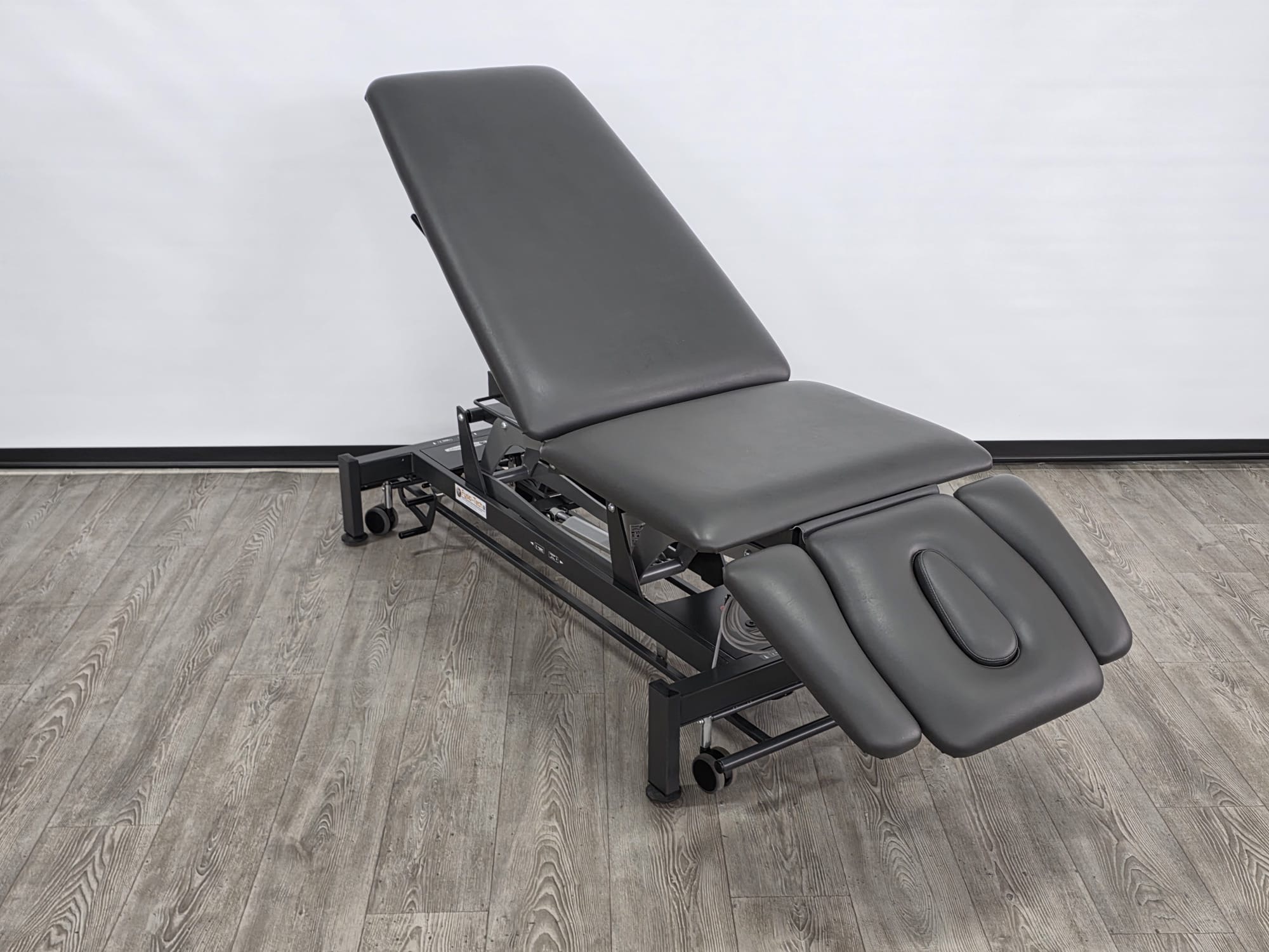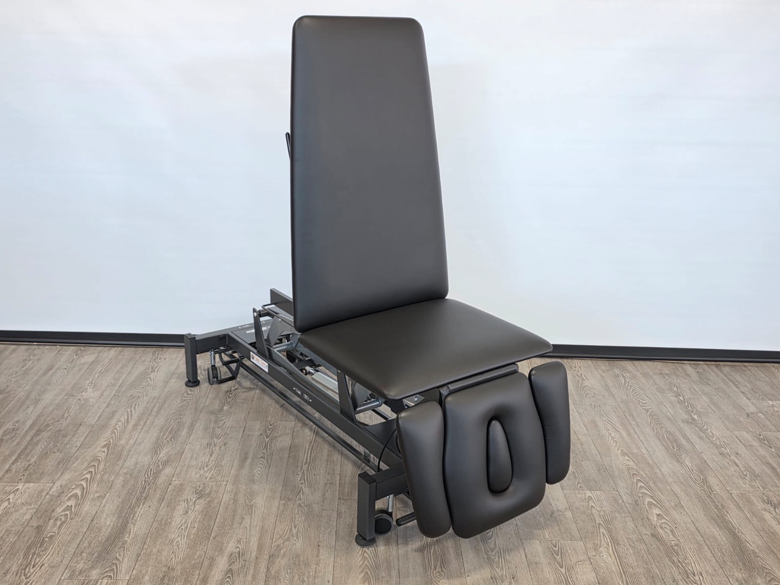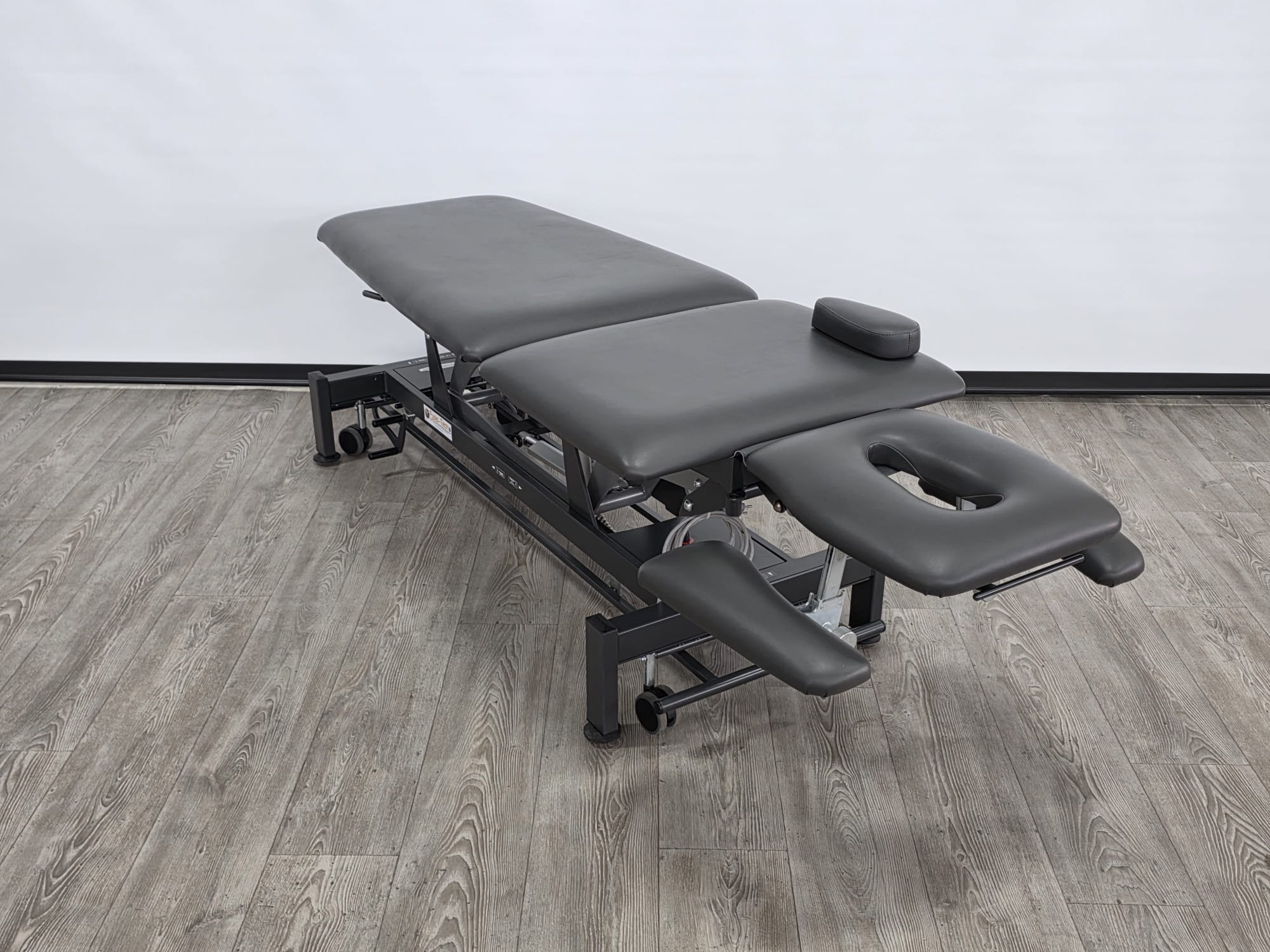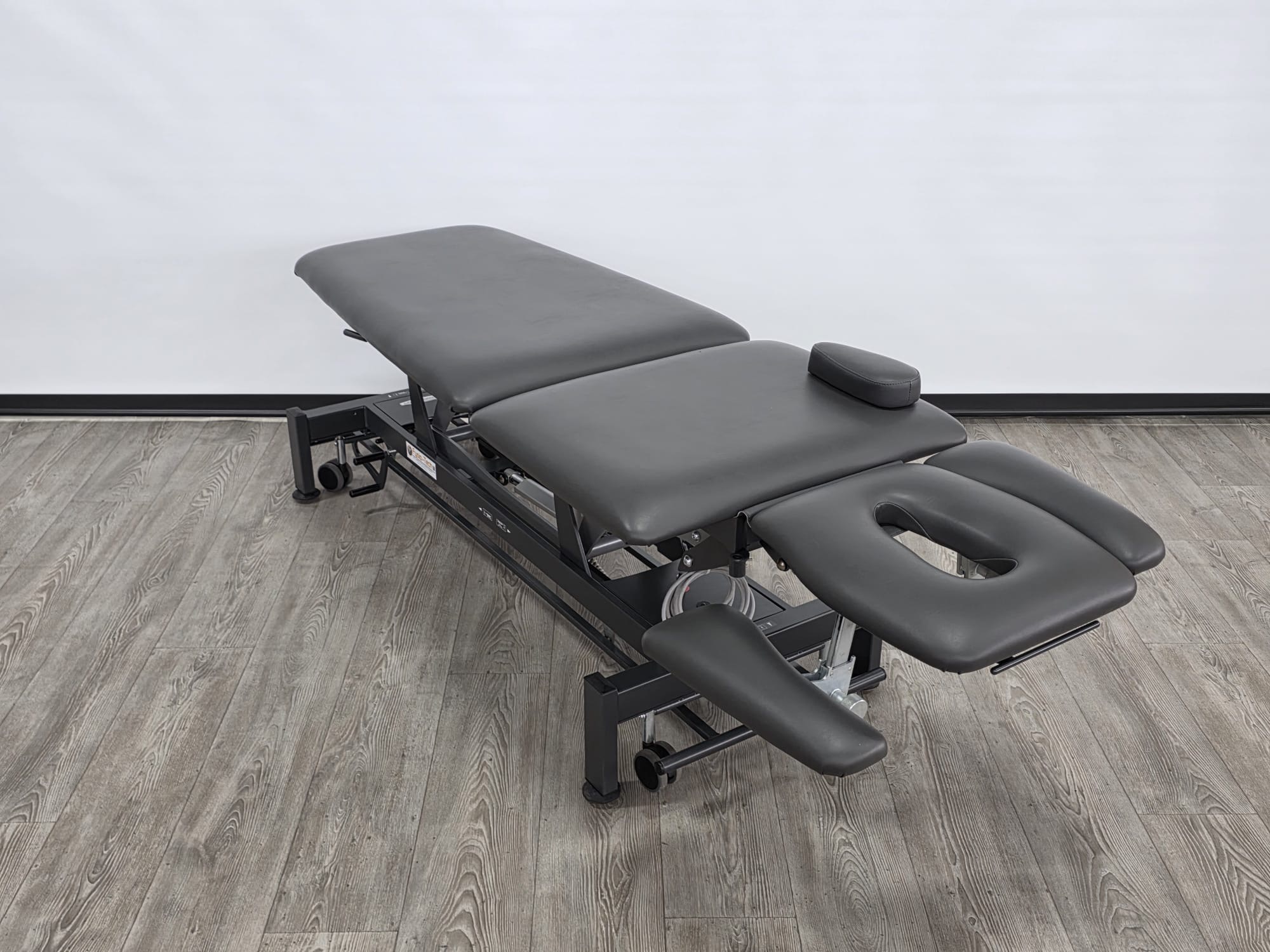 De behandeltafel is voorzien van wielen en een centraal wielhefsysteem. Alle delen kunnen worden bediend doormiddel van gasveren.
