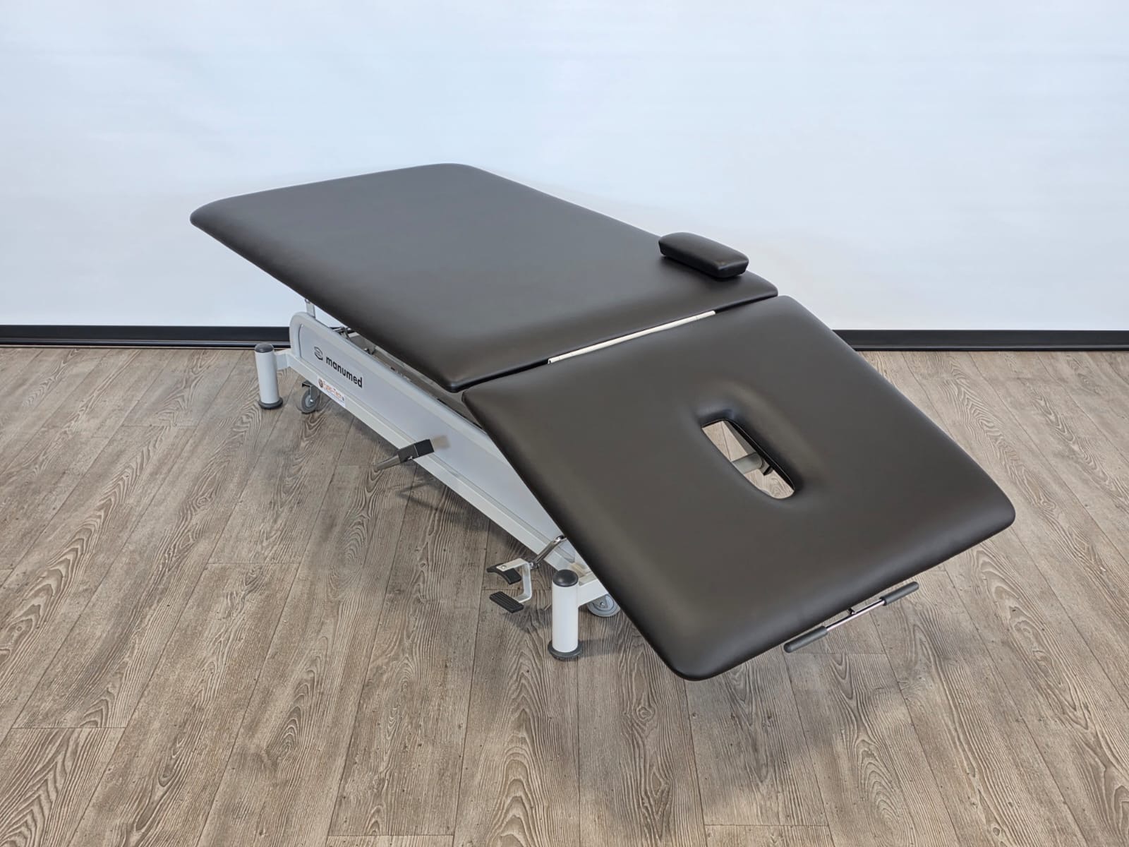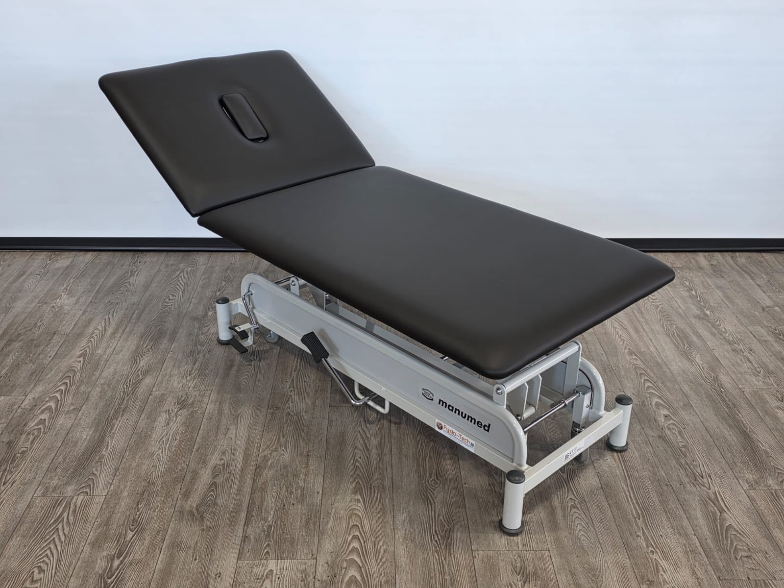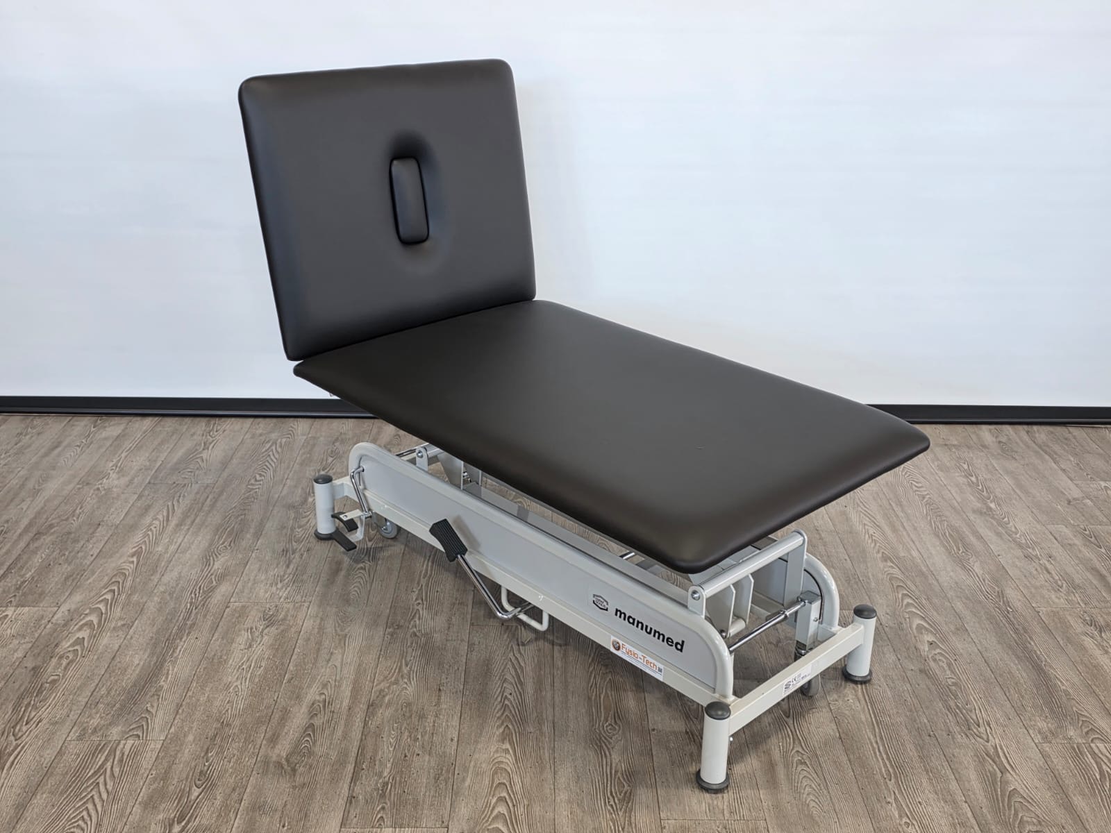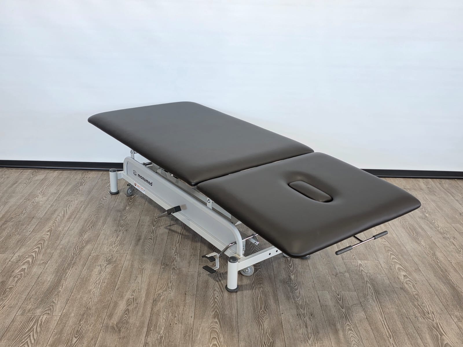 Deze professionele behandeltafel is hydraulisch in hoogte verstelbaar doormiddel van een pomp met twee beugels. De behandeltafel is voorzien van wielen en een centraal wielhefsysteem. Het rugdeel is traploos verstelbaar door middel van een gasveer.