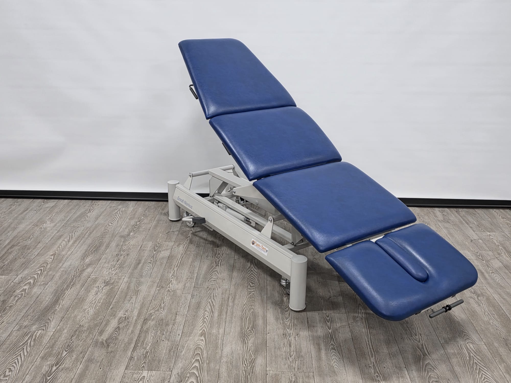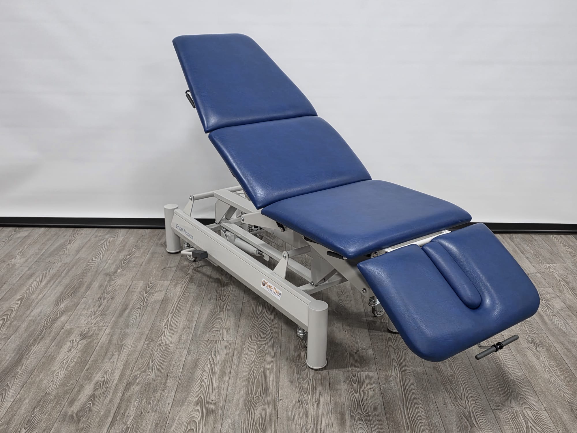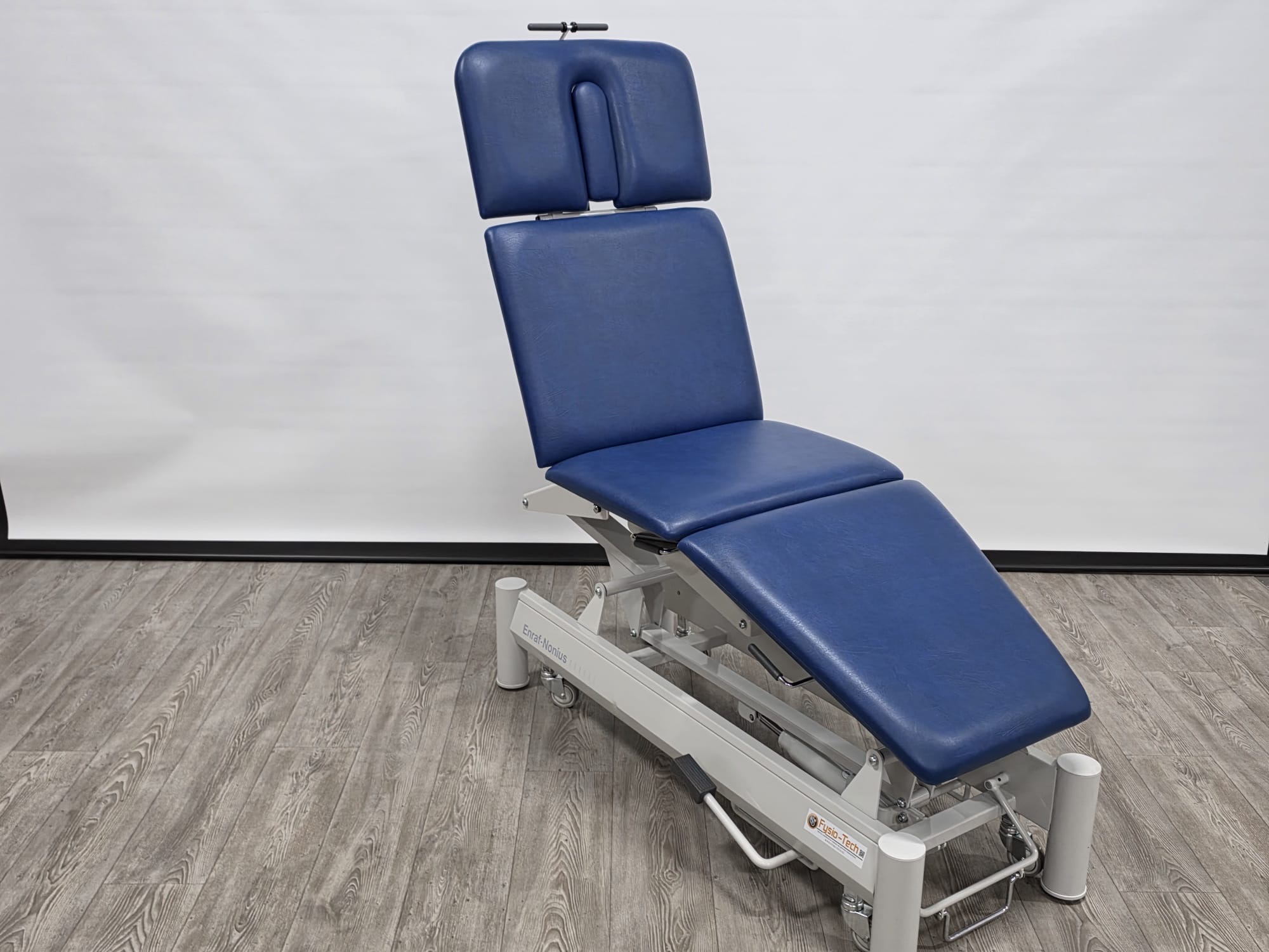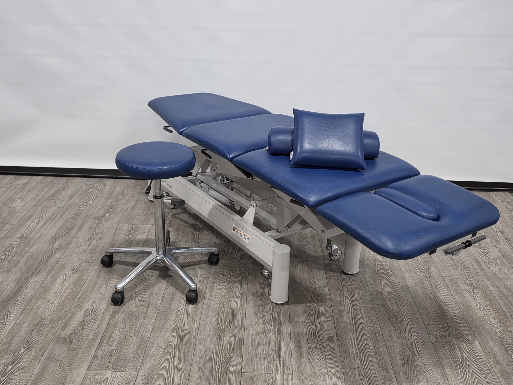 Deze Enraf-Nonius vierdelige behandeltafel wordt geleverd als complete set, inclusief bijpassende taburet, massagekussen en massagerol. Ideaal voor fysiotherapie, massage, revalidatie en andere behandelingen.