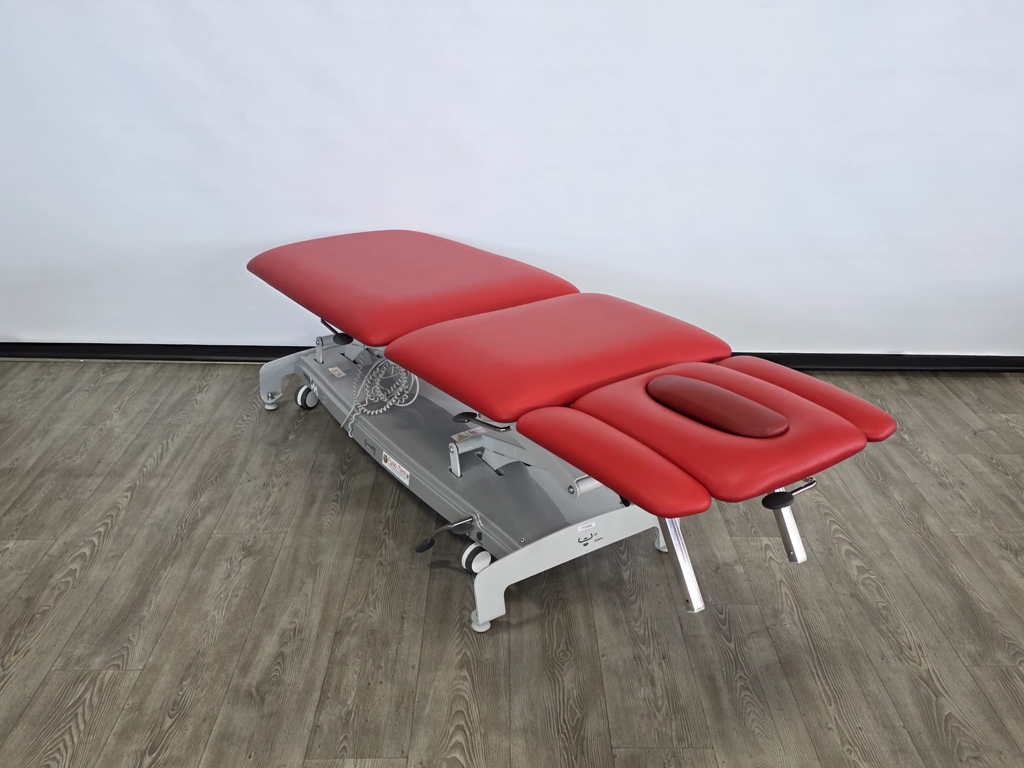 Deze professionele behandeltafel is elektrisch in hoogte verstelbaar door middel van een voetschakelaar.